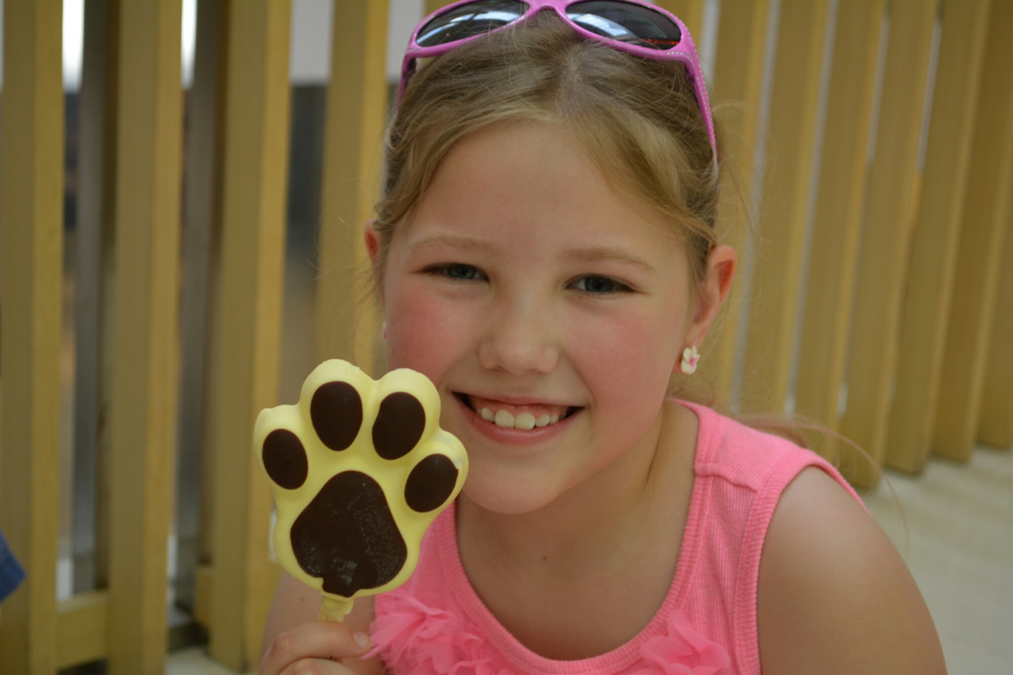 Abby and Jamie both had raspberry hearts – just made out of smooshed and frozen raspberries. I had chocolate paw. It was vanilla icecream with chocolate bits in it. It was covered in white chocolate with regular chocolate splodges.